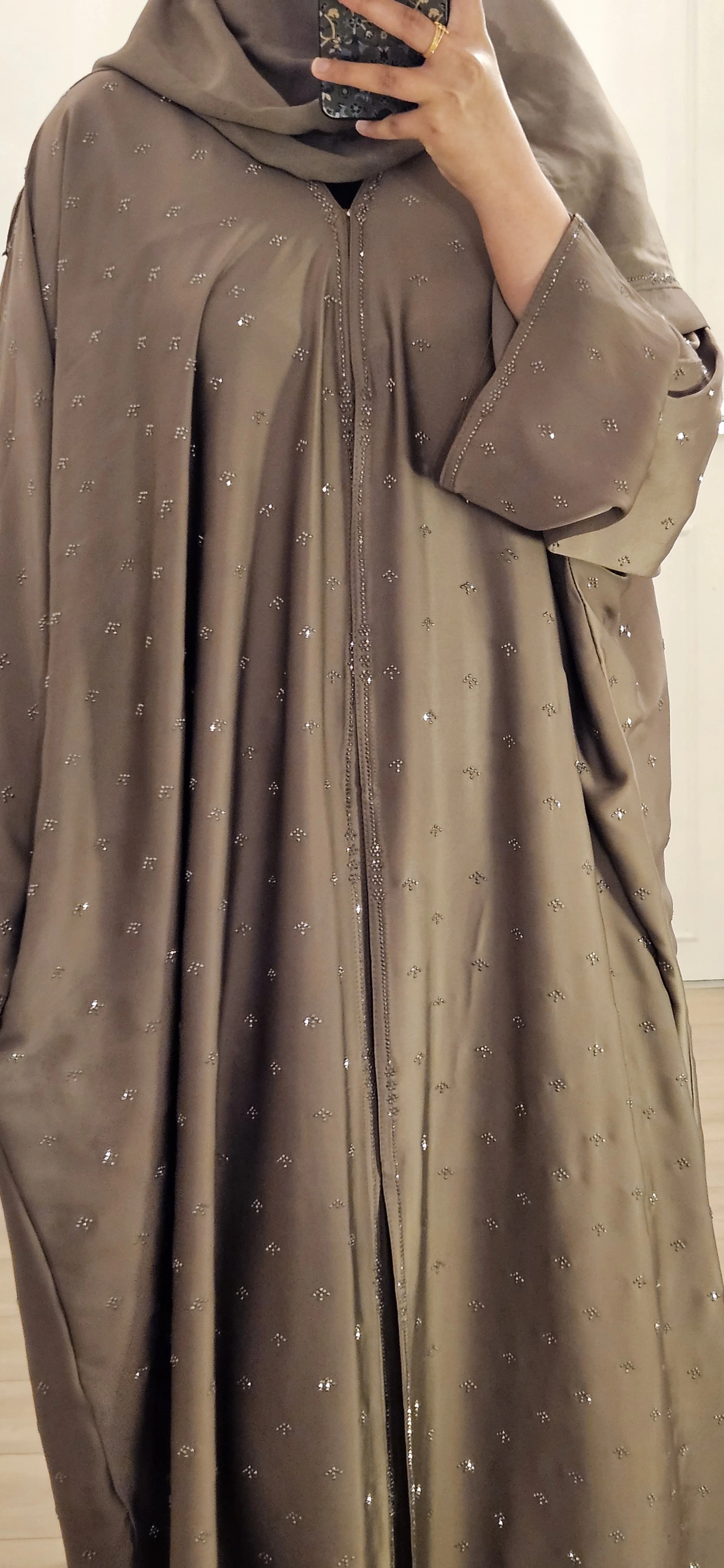 This stunning shimmer dress radiates elegance with its delicate beaded detailing along the neckline and sleeves, adding a touch of sparkle without overwhelming the look. Dress comes with a inner slip dress, hijab and belt.