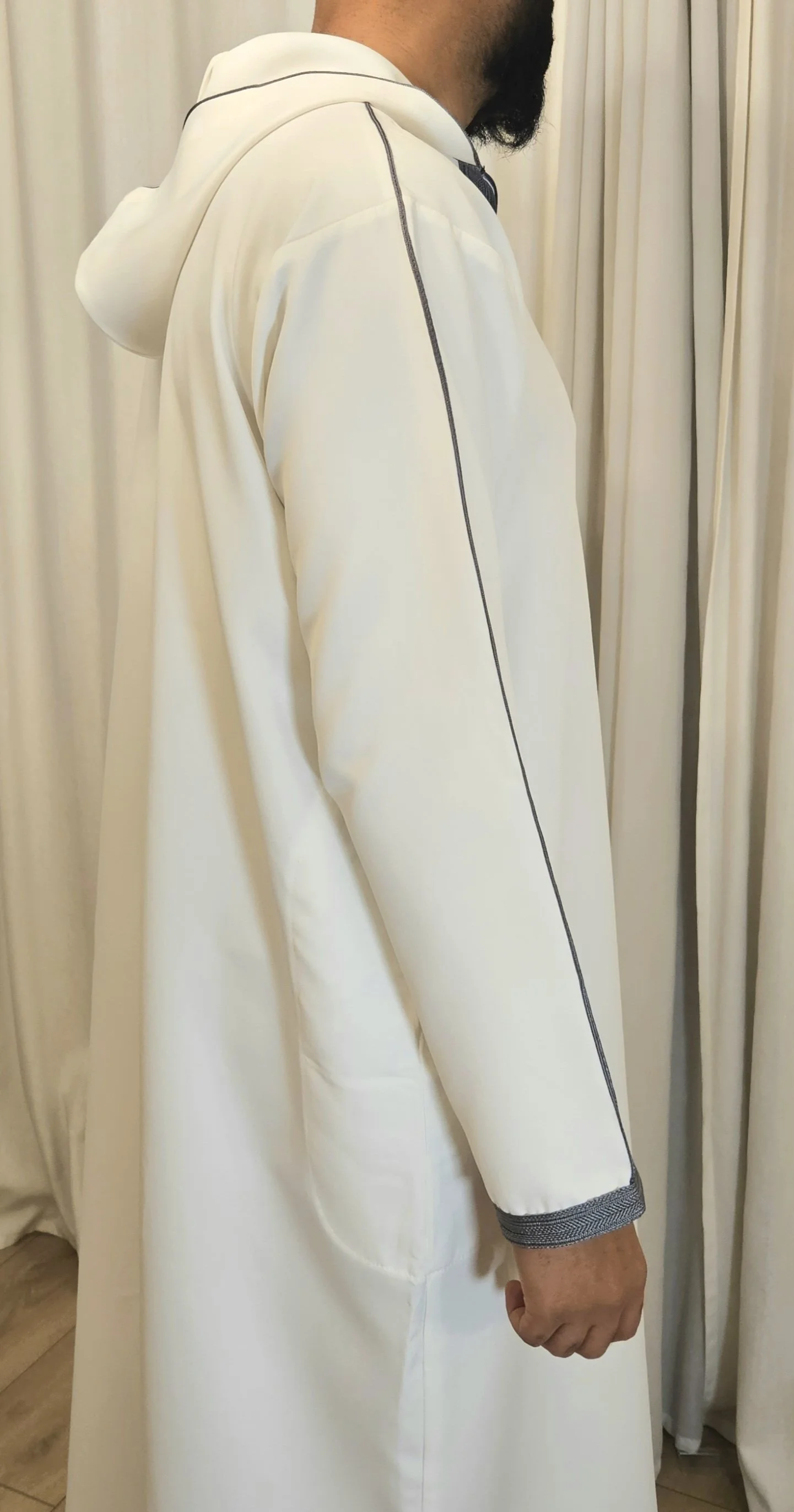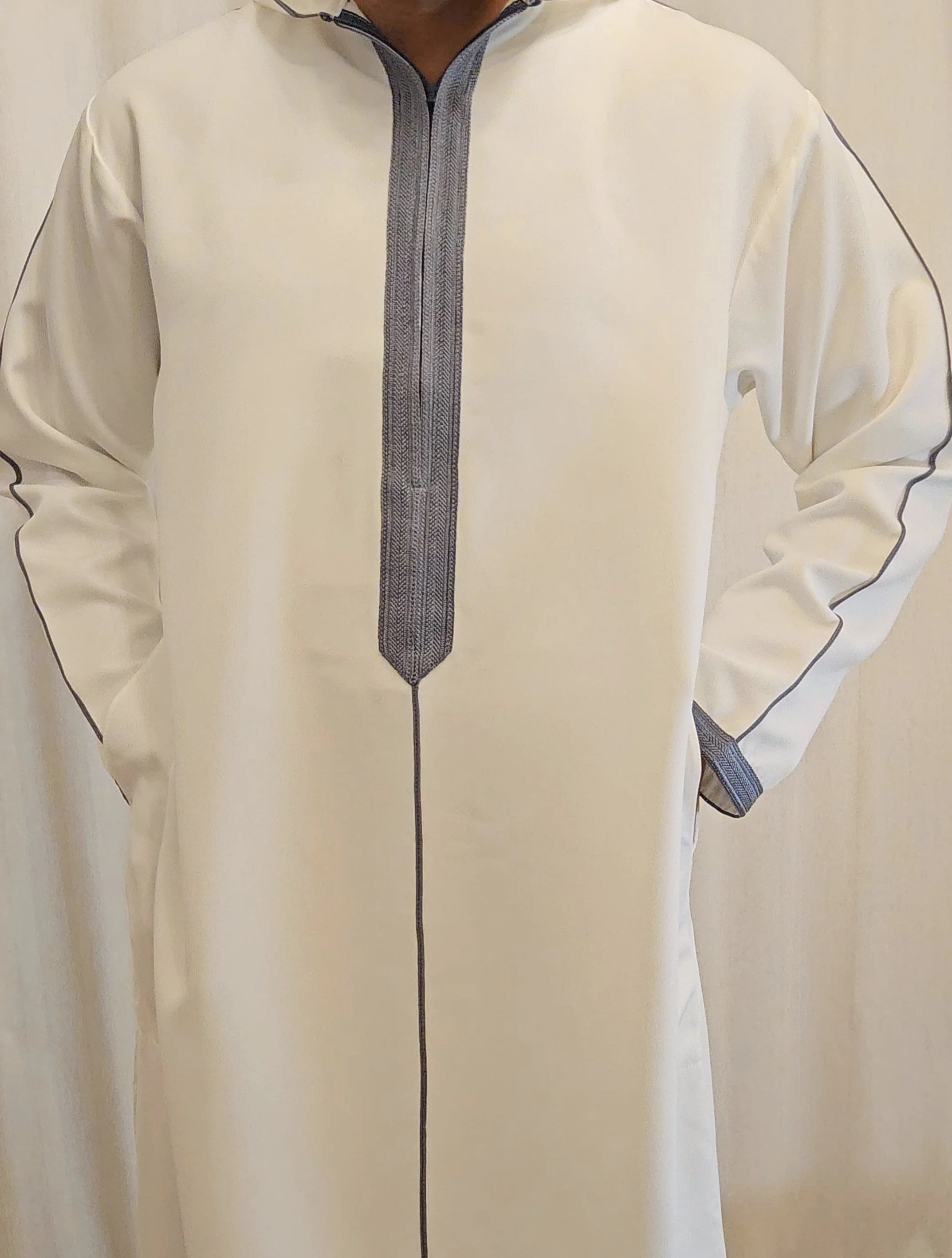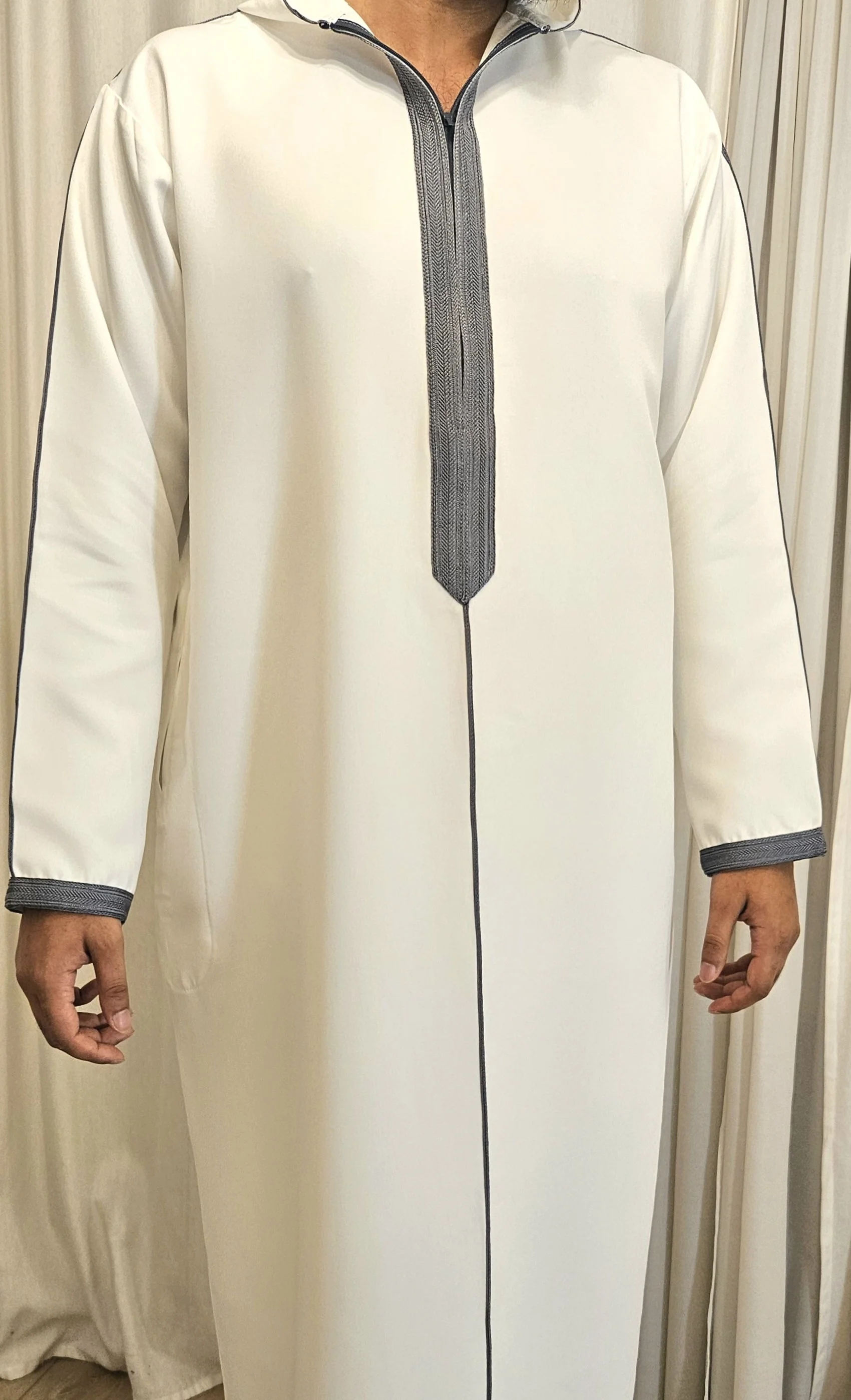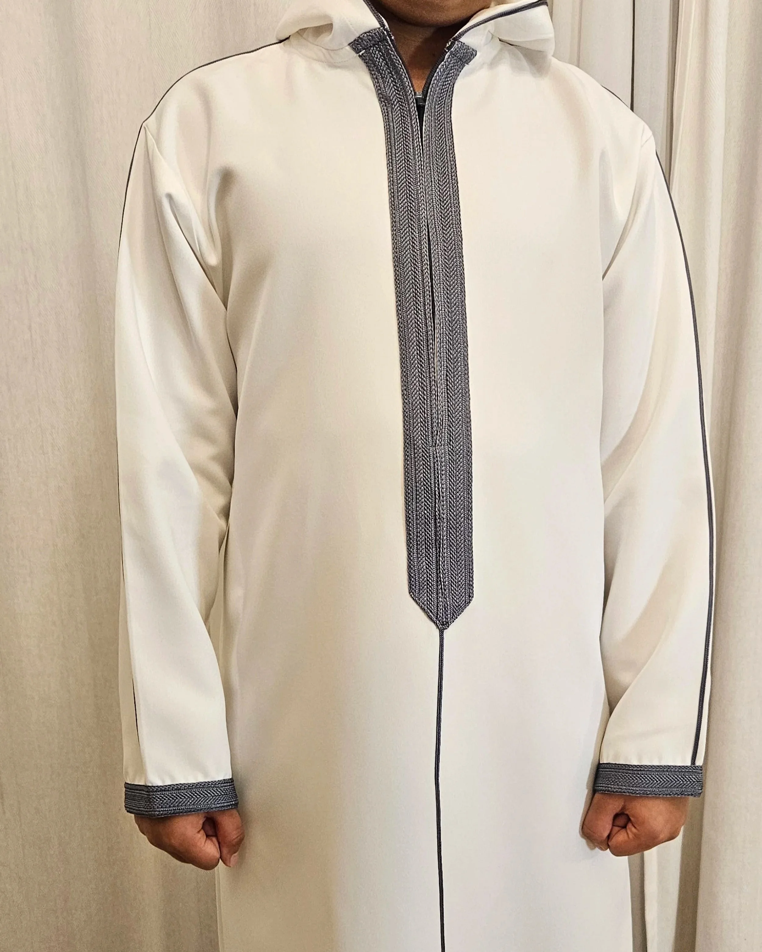 The pearl white men's thobe with a hood and zip combines traditional elegance with modern functionality. Crafted from high-quality, breathable fabric, this thobe offers a sleek charcoal shade that complements all skin tones. The addition of a hood adds a contemporary twist, providing extra coverage and style, perfect for casual or semi-formal occasions. A discreet, smooth-running zip allows easy wear and removal while maintaining the garment’s clean lines.